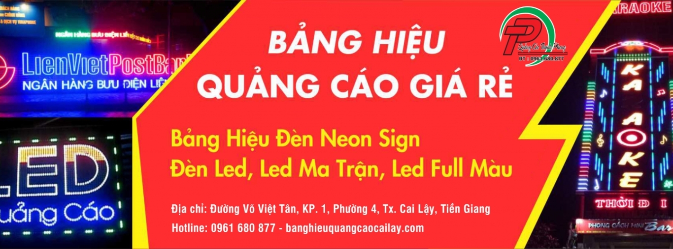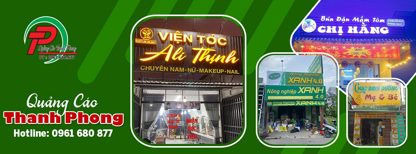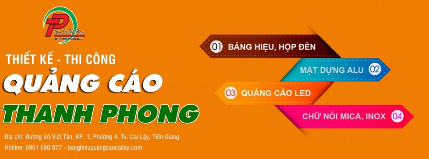 Quảng Cáo Thanh Phong là đơn vị chuyên thiết kế / thi công lĩnh vực: Thi công bảng hiệu quảng cáo Alumium, bảng hiệu inox, bảng hiệu mica, hộp đèn ,chữ nổi, ốp Aluminium….,tại Cai Lậy ,Tiền Giang . Ý tưởng, sự sáng tạo và chất lượng sản phẩm là mục tiêu hàng đầu của chúng tôi nhằm mang đến sản phẩm tốt nhất cho khách hàng. Với hơn 10 năm kinh nghiệm cùng đội ngũ nhân sự lành nghề và chuyên nghiệp, chúng tôi đã thi công cho hàng nghìn khách hàng khác nhau, luôn được đánh giá là đơn vị cung cấp dịch vụ thi công bảng hiệu quảng cáo hàng đầu tại Tiền Giang